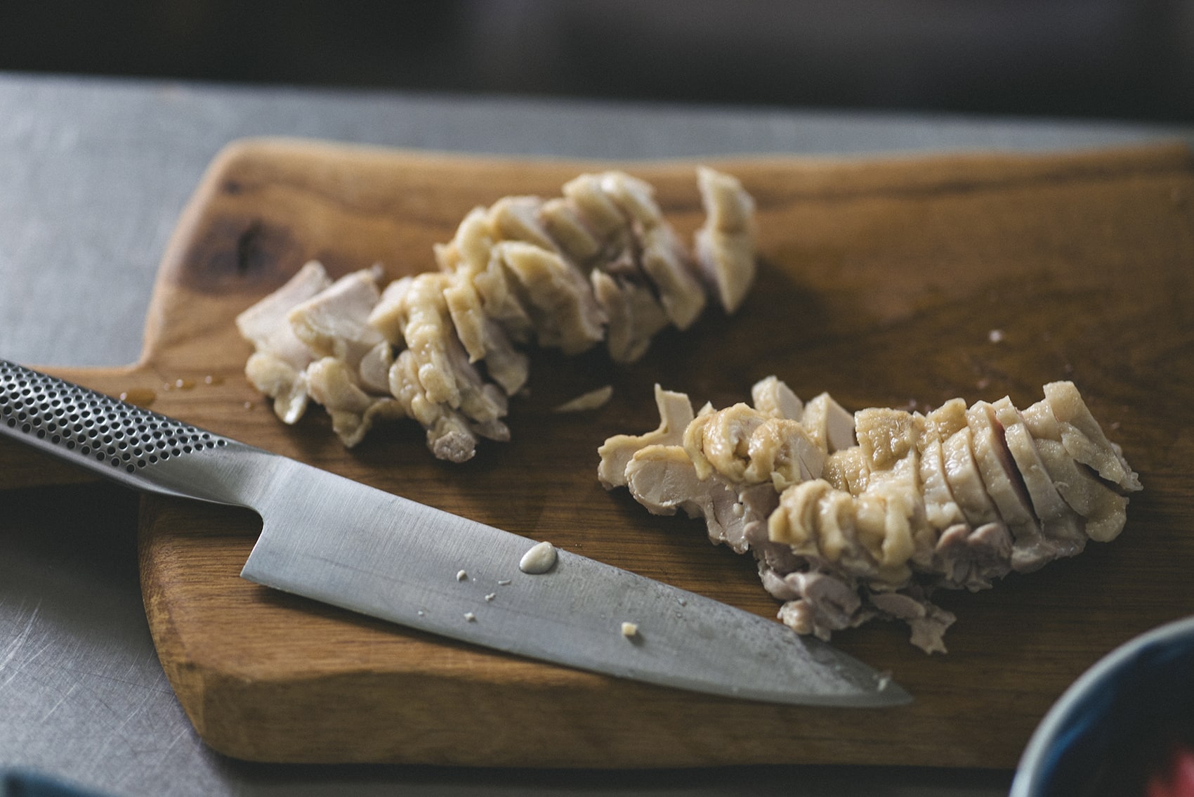 蒸し鶏は、塩少々をまぶした鶏もも肉1枚をひたひたより少し多めの水に入れて、ねぎの青い部分1本分、酒50ccを加えて、中火にかけて15分。火を止めて、冷めるまでそのままに。