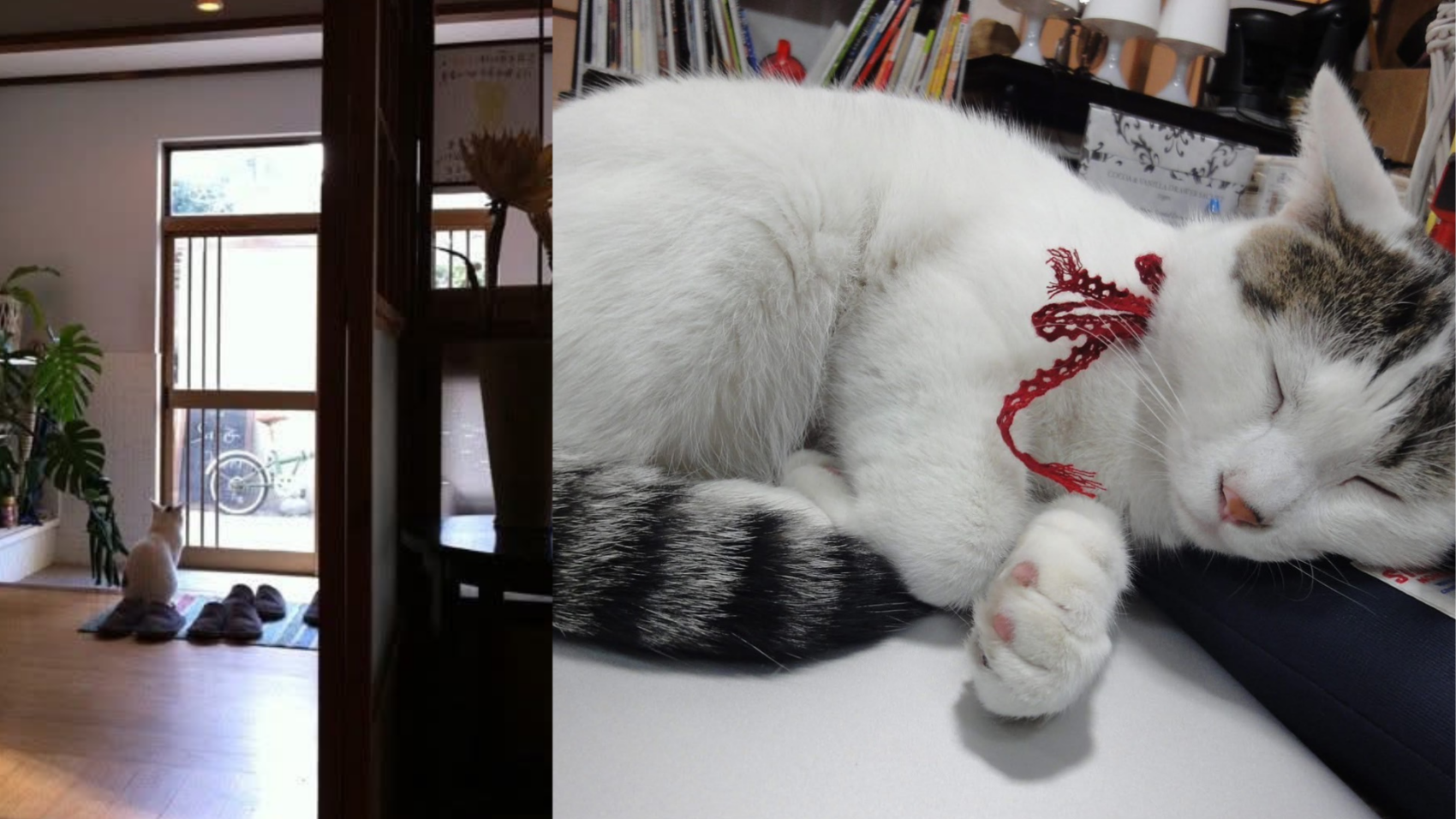 最初の年は箱入りで育ったチョビ、成長と共に部屋の中に篭っているのは窮屈になって、だんだんと宿の猫、看板猫としての素質を発揮していく。ある時、何日かご飯を食べた形跡はあるのに姿が見えなくて、どこにいるのかと心配していたら、一人旅の女の子が「あっ!私の部屋にずっとチョビちゃんいます!」という事もあった。そしてお水が飲みたい時には、廊下にある水道の蛇口をお客様に捻って出してもらう技も身につけた。ニャンと呼び止め、蛇口のところまで誘導していた。宿がスタートして2年経った頃に、トシくんが島を離れる事になって、チョビは正式にSaroの看板猫となったのだ。宿を閉じるまで看板猫をその後も2年務めて、引退後は僕の母親と実家でのんびり暮らしたが、現在のマンションに越してからは、僕が養子になった高齢姉妹のケアに専念、今は家人と仲良しである。とにかく人に寄り添う姿は、宿時代に身につけた処世術なのであろうか。