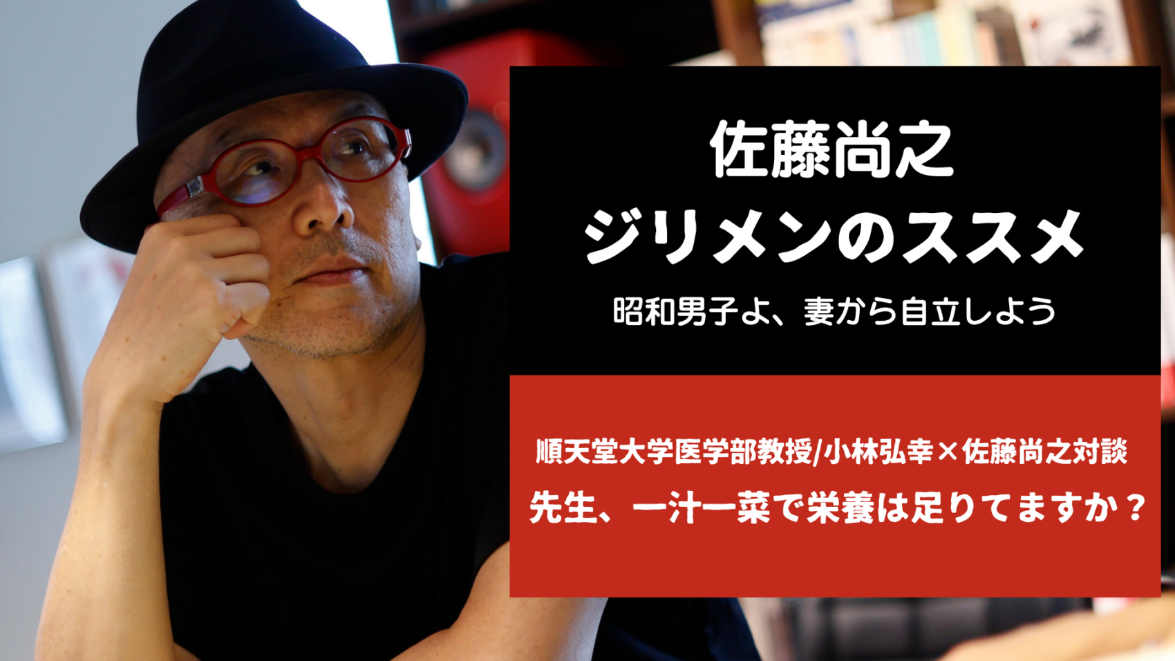 最低限の料理と掃除などの家事ができる“生活面で自立した男=ジリメン“。コミュニケーション・ディレクター佐藤尚之さんのこの連載では、「自立のための、継続できる料理」として一汁一菜をすすめています。具だくさんの味噌汁にごはん、それにゆで卵などの簡単な副菜の一汁一菜は、著者である佐藤さんがすでに3年以上継続している食事の形です。佐藤さん自身、体重減にも成功し、健康診断の結果もすべて好転、ただし、これを人にすすめるときに気になるのが「栄養」でした。そこで佐藤さんがお話を伺ったのが順天堂大学医学部の小林弘幸教授。知らなかった、興味深い話が盛りだくさんの対談です。