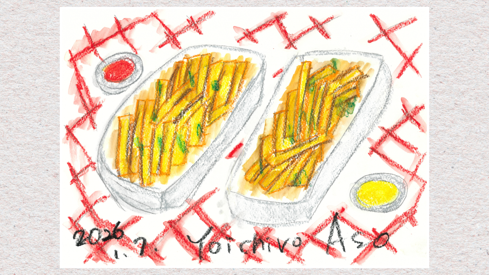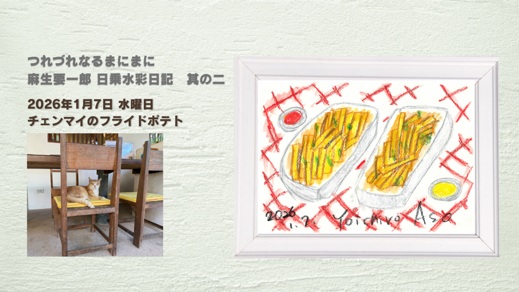 先月から開始されたこの連載もまさにその一つ、麻生要一郎初めての水彩画による絵日記です。2026年年初、家族のような友人と訪れたタイ、チェンマイのある日のこと。