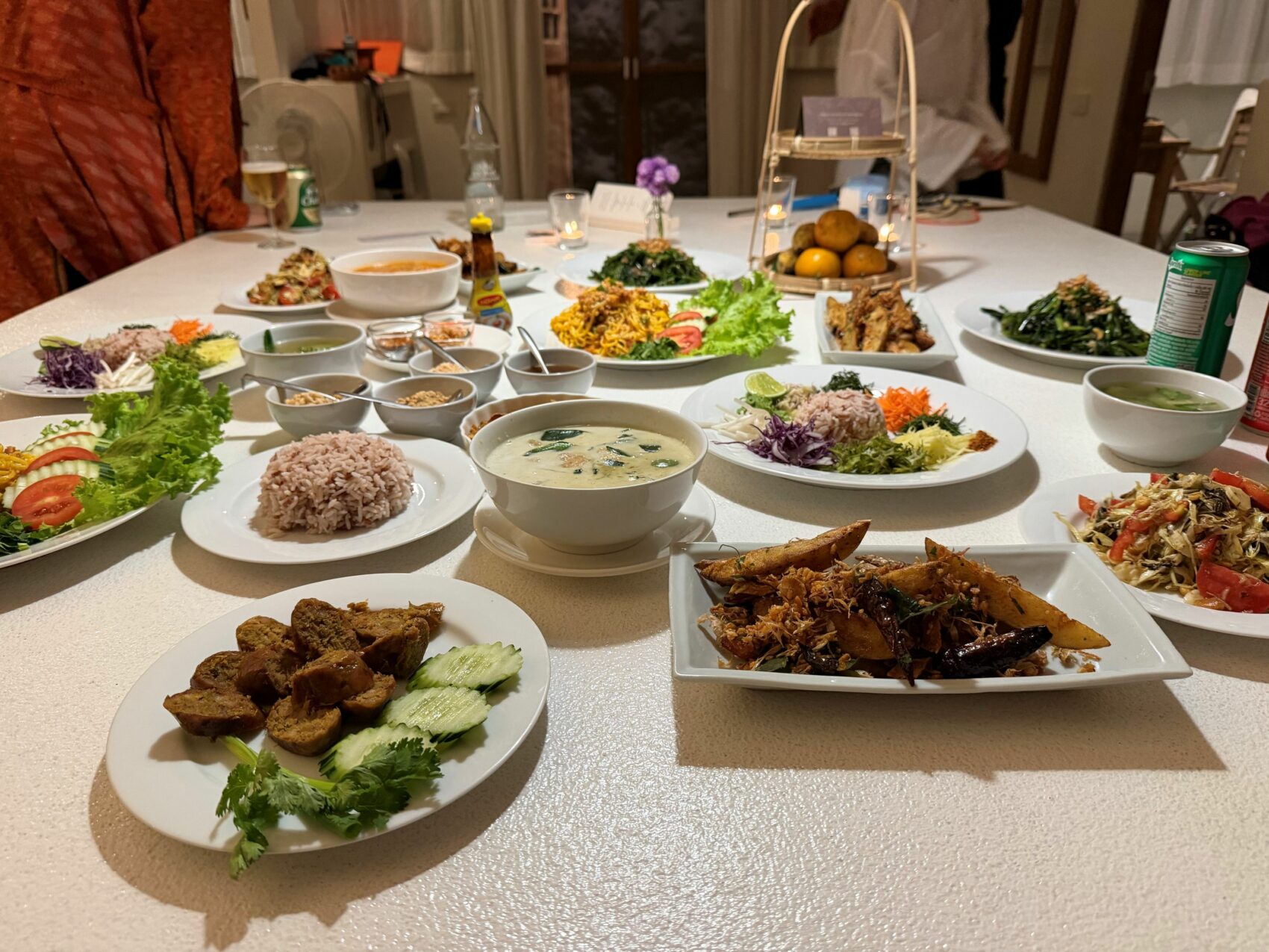 初日の夜は、コテージに食事を用意してもらった。ピリッと辛いチェンマイソーセージ、ヤムウンセン、空芯菜炒め、グリーンカレー、コブみかんの風味が効いていたタイ風フライドポテト、スーパーで調達した果物を食べた。2日目は街を散策、ガイドブックで発見して行きたいと思っていた、革や紙製品を扱うクラフトショップを訪問、自分で使うノートやお土産を買って満足。陽が傾いて歩き疲れた頃に、偶然通りかかった夜市で、皆で今夜どう過ごすかの会議をしようと中に入る。入口付近の、フライドポテト屋さんで、なまこちゃんと一緒に、プレーンとチーズフレイバーを頼んだ。小さいサイズか大きいサイズを選べたが、大きいサイズを選んだら、山のような量だった。丁寧に揚げられて塩加減は絶妙、食べきれない量だと思ったが、次から次へと手が伸びて、あっという間に完食、お昼が遅かった事もあり、それが夕食となった。
